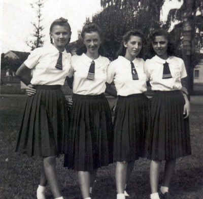 Foto da década de 40, de alunas do Ginásio Municipal, que era instalado na Praça 10 de Março, em um prédio em frente a Sorveteria Rainha. (1) Tereza França, (2) Lourdes Nielsen Mirândola,