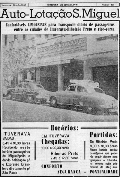 Em 1957, onde a locomoção era extremamente difícil devido às más condições das estradas, e com poucas alternativas de transporte, existia, em Ituverava, a Auto-Lotação São Miguel, de propriedade do ituveravense Miguel Liporaci Sobrinho, (Guelo). Na época, os modernos carros eram conhecidos como limusine, que levavam e traziam diariamente passageiros entre Ituverava e Ribeirão Preto.