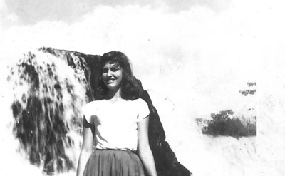 Edna Francelin Ribeiro, em foto tirada em setembro de 59, na Cachoeira Salto Belo, quando tinha 17 anos. Ela é casada com Edson Ribeiro da Rocha e tem os filhos Edson Francelin Ribeiro da Rocha, casado com Kelli Cristina da Rocha; Kaio Marcelo Ribeiro da Rocha, casado com Cibele