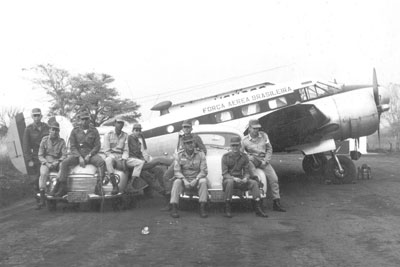 Atiradores da turma de 69, no campo de aviação fazem guarda de um avião da FAB, que pernoitou em Ituverava, provavelmente em uma missão especial, já que estávamos no auge da repressão militar da Revolução de 1.964. (1) Paulo Augusto Chereguine; (2) Cavalcanti Viana Galli, (3) José Maurício de Oliveira, (4) Cristiano Tavares Figueiredo, (5) José Augusto Martins Mendes da Silva, (6) João Humberto Vancine, (7) o comandante do TG, o sargento Lecine Freitas da Silva; (8) Antonio Carlos Rodrigues da Silveira (“Tatai”) e (9) Waldemar Telles Torraca