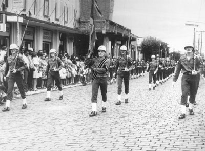 A turma de 1969, do Tiro de Guerra desfilando nas festividades de 7 de Setembro, Dia da Independência do Brasil. A foto foi tirada na Avenida Dr. Soares de Oliveira, em frente à Radiolux (onde hoje está instalada a Livraria Vanguarda): (1) Vander de Matos Rezende, (2) José Augusto Martins Mendes da Silva; (3) José Antônio Hiesinger Rodrigues; (4) Cristiano Tavares Figueiredo; (5) Wagner de Matos Resende; (6) Valdemar Telles Torraca e (7) Paulo Augusto Chereguini