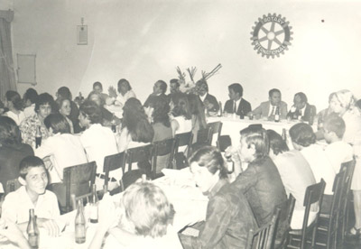 Foto de outubro de 1971, da posse da estudante Maria Cristina de Freitas Rocha (“Kikina”), na presidência do Interact Club, em solenidade realizada na sede do Rotary Club. (1) a presidente Maria Cristina de Freitas Rocha (“Kikina”), a mesa principal (2) Octacílio de Paula, (3) não identificado, (4) Durval Dias de Oliveira, (5) Dr. Jayr de Paula Ribeiro, (6) José Joaquim de Paula Ribeiro (Quim), (7) Maria Bernadete Coimbra Amêndola, (8) Benedito Trajano Borges Filho, (9) Antonio dos Santos Bonadio (“Caveira”), (10) Jorge Chaebub Filho, (11) Simone Sinhorini Chaebub, (12) Maria Tereza Nogueira Bombig (“Tuta”), (13) Carlos