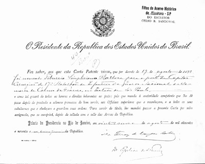 Documento expedido em 25 de agosto de 1898, pelo Presidente da República dos Estados Unidos do Brasil, dr. Epitácio Pessoa, nomeado Tibúrcio Simpliciano Barbosa para o posto de Capitão Cirurgião do 17º Batalhão de Infantaria da Guarda Nacional da Comarca de Carmo da Franca, no Estado de São Paulo.