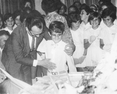 Foto de 1970, de uma solenidade realizada no Salão Nobre do Instituto de Educação Antonio Justino Falleiros, quando o aluno Renato Chaebub Rodrigues (“Tim”), recebia o Livro do Ano (que eram entregues aos alunos no final do ano letivo, aos alunos que aprendiam a ler), do diretor da escola, José Ignácio de Azevedo Filho. (1) Renato Chaebub Rodrigues (“Tim”), que tinha 7 anos, (2) José Ignácio de Azevedo Filho e, (3) de costa, a professora Ivete Mendonça Soares de Oliveira