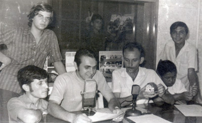 Em agosto de 1970, foto no estúdio da Rádio Cultura de Ituverava. (1) Carlos Alberto Amêndola, (2) Luiz Fernando Henrique dos Santos, (3) Benedito Galdiano, (4) José Valizi e (5) Benclei Costa Vasconcelos