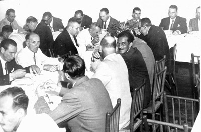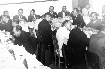 Continuidade da festa em homenagem ao senador Auro de Moura Andrade. (1) Dr. Cláudio Guimarães César, (2) dr. Amintas Machado, (3) o senador Auro de Moura Andrade, (4) José de Paula Leão, que era presidente da Câmara Municipal, (5) o prefeito João Athayde de Souza, (6) Arcísio Ribeiro, (7) Nagib Jammal, (8) o jornalista Adhemar Cassiano que também era vereador, (9) Severino Spesiano, vereador, (1) Telcio da Silva, secretário da Prefeitura, (11) Arari Simpliciano Barbosa (12) Santinho Rezende, (13) José de Mello Borges, (14) José Antônio Salgado, vereador