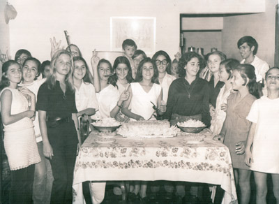 Foto do ano de 1971, do aniversário de 15 anos de Cleuza Mariano Viaro, na residência de seus pais Arcênio Viaro e Edna Mariano Viaro. (1) Vera Nader, (2) Denise Jardim, (3) Nélia Santiago Pontes, (4) América de Menezes, (5) Solange Bavaresco, (6) Lígia Rodrigues Tosta, (7) Maria