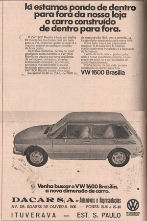 Publicidade veiculada no jornal Tribuna de Ituverava no ano de 1973, no lançamento o VW 1600 Brasília, que era um dos veículos mais modernos da época e, desejo de consumo da população
