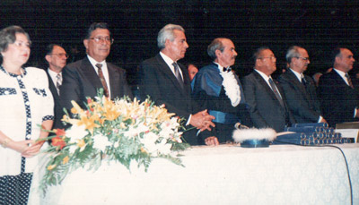 Formatura dos 23 alunos da primeira turma do curso de Agronomia da Faculdade dr. Francisco Maeda, da Fundação Educacional de Ituverava, dia 18 de julho de 1992, o presidente da instituição de ensino era o empresário Romeu Barbosa e o diretor-executivo o professor Alexandre Miguel (“Bueno”) (in memoriam). (1) e (2) o prefeito Ecyr Alves Ferreira e a primeira-dama Zélia Mota Ferreira, (3) o paraninfo da turma foi o governador do Estado de Goiás, Iris Rezende, (4) o diretor da Fafram dr. Heitor Werther Stuart Montenegro (in memoriam), (5) o empresário Takayuki Maeda (in memoriam), (6) o presidente da Câmara José Ignácio de Azevedo Filho (in memoriam), (7) o médico e ex-prefeito Archibaldo Moreira Coimbra (in memoriam), e (8) Leonardo Lorécchio, diretor da FEI
