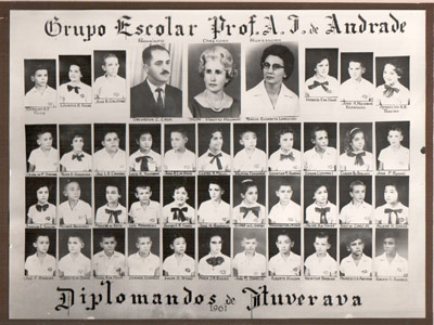 Diplomandos da turma de 1961, do Grupo Escolar Prof. “Antonio Justino de Andrade”. O paraninfo da turma ((1) o prefeito Salvador Cordaro Cruz, (2) a diretora Silda Vidotto Hiesinger e (3) a professora Teresa Elisabeth Lorecchio. Os formandos: (4) Geraldo Alves Ferreira Filho, (5) Lourdes B. Soler, (6) José Benedito Galdiano, (7) Irandir Ferreira da Silva, (8) José Antonio Hiesinger Rodrigues, (9) Aparecida H. B. Pereira, Cezar de P. Santana, (10) Telma C. Gonçalves, (12) José Luiz Alves Cassiano, (13) Luzia K. Yoshinaga, (14) José Alberto Contart de Assis, (15) Cleire Henrique Melki, (16) Valdomiro Fukuhara, (17) Leontina M. Rodrigues, (18) Edson Liporaci, (19) Cleusa Aparecida Ameloti, (20) José Procópio Pistori, (21) Aparecida C. Teixeira, (22) Milton K, Nagasako, (23) Marlene de Brito, (24) Luiz Massarioli, (25) Regina E. Nilsen Tinasi, (26) José Honório Prudêncio, (27) Eliana de Lima Gambi, (28) Washington Luiz Miranda Cruz, (29) Jacira B. de Souza, (30) Percy de Carli Jr, (32) Helena N. Yoneda, (33) José P. Barbosa, (34) Flávio G. de Souza, (35) Miguel A. da Silva, (36) Devanir Gonzalez, (37) Edson S. Tatsuo, (38) Maria José Modes Pereira, (39) João Maurício Barreto, (40) Alberto Kunió Kikuda,