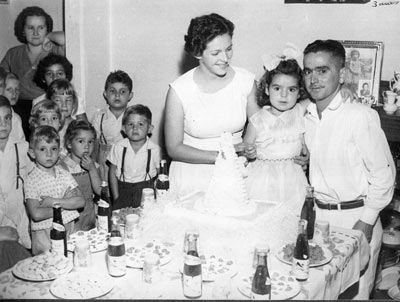 Foto de 14 de agosto de 1958, do aniversário de Maria das Dores Alves Ferreira Azevedo (Dodô), na residência dos seus pais. Ela é casada com Carlos Alberto Inácio Azevedo e tem as filhas Vanessa Alves de Azevedo e Natália Alves de Azevedo. (1) a aniversariante Maria das Dores Alves Ferreira, (2) e (3) os pais Maria Ignês Bernardes Ferreira e Eurico Alves Ferreira (“Euriquinho da Farmácia”), (4) José Milton Alves (“Tiquinho”), (5) José Luiz Alves