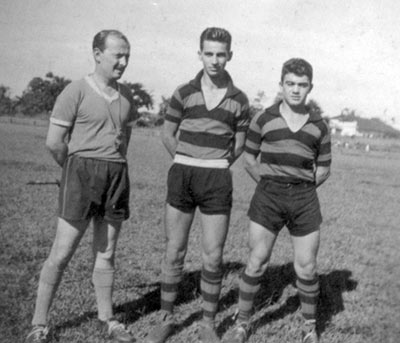 Foto dos anos 50, no campo da Associação Atlética ituveravense, (1) o médico dr. Mário Vianna de Vasconcelos, que era um entusiasta do futebol, os craques (2) o quarto-zagueiro Carlito Dias Santiago e (3) Celso Nunes (“Piolim”), que era lateral-direito