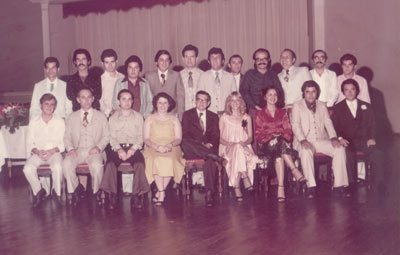 Recepção em homenagem ao sr. Benedito de Mattos por ocasião de sua aposentadoria como gerente da agência de Ituverava do Banco do Commércio e Indústria de São Paulo S/A (Comind). A solenidade foi realizada em 1978, no salão de festas da Associação Atlética Ituveravense. (1) Hélio Pereira Vaz, (2) Altair da Silva, (3) Milson Luís Liporaci, (4) Antônio Carlos de Paula, (5) Laércio Fogaça de Souza, (6) Sebastião Celso de Oliveira, (7) Valter da Silva Sampaio, (8) José Paulo Barbosa, (9) Jerônimo Moreira da Silva, (10) Aguiar Athayde de Souza, (11) Wilson Antônio Matos Alves, (12) Carlos Fontebaci. Sentados: (13) Aparecido Fátimo Bento, (14) Accácio Antônio Borghini, (15) Sebastião Ferreira Barbosa, (16) Neusa Maria Graner, (17) o gerente Benedito de Mattos que foi homenageado, (18) Dilma Ribeiro Rocha, (19) Maria Isabel Alves, (20) Sebastião Luiz Gonçalves e (21) José Nascimento de Assis