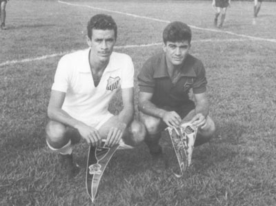 Foto dos anos 60, quando o time misto do Santos Futebol Clube jogou amistosamente em Ituverava, contra a equipe da Associação Atlética Ituveravense, o Tigre do Ramal. (1) O lateral-direito Getúlio, (2) Celso Nunes da Silva (“Piolim”) que também jogava de lateral-direito