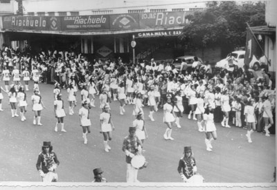 Foto do desfile das festividades do Dia da Independência do Brasil, em 7 de setembro de 1973, dos alunos da então Escola Estadual do Primeiro e Segundo Grau “Humberto França”. O desfile passava pela Avenida Doutor Soares de Oliveira, (1) em frente às Lojas Riachuelo (hoje Amarelinhas da Sorte), (2) e a Triunfal Calçados