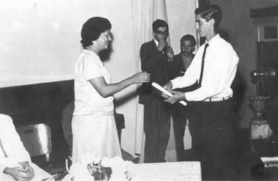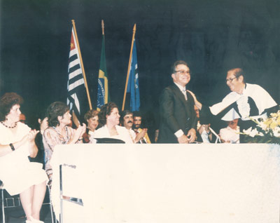 Foto dos anos 60, da entrega de diplomas da formatura da Escola Técnica de Comércio de Ituverava. (1) a professora Angelina Monteriro Ferreira Alves Ferreira (in memoriam), (2) o formando Ademar de Paula Freitas (“Pézinho”), os radialistas (3) Lianês Alves Ferreira e (4) José Nelson de Carvalho (in memoriam), que era proprietário da Rádio Cultura