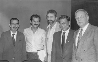 No ano de 1989, o prefeito dr. Ecyr Alves Ferreira, assinava convênio em São Paulo, na secretaria de Energia e Saneamento, com o então secretário João Leiva Filho. (1) o prefeito Ecyr Alves Ferreira, (2) o secretário João Leiva Filho, (3) o vereador Ademar de Paula Freitas, (4) o engenheiro da Prefeitura, Vander Luiz Silva de Castro e (5) o assessor do secretário