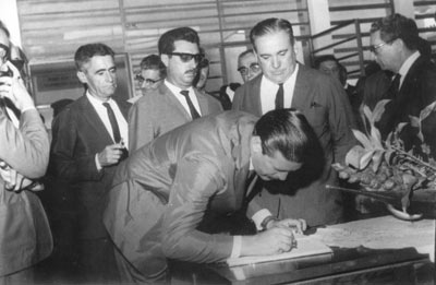 Foto de 1966, de assinatura de convênio entre o município e o governo do estado. (1) o prefeito Orlando Seixa Rego, (2) o Presidente da Câmara, José Luiz da Silva, os vereadores: (3) José Ferreira Telles (Dr. Juquinha), (4) José Alípio Furquim Fonseca, (5) dr. Gabriel Justino de Figueiredo (“dr. Bié”), (6) Nestor Alves Ferreira, (7) o padre Ângelo D’Alara