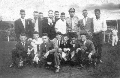 Turma de atirados de 1960, turma de 1941, em reunião de confraternização: (1) Airton Menezes da Silva, (2) José Tomaz de Souza (“Bichim”), (3) Não identificado , (4) José Augusto Lopes, (5) Aguiar Ataíde de Souza, (6) Capitão Washington de Souza Gomes, que na época era sargento e comandante do TG, (7) João Batista Barbosa, (8) Nivaldo Galdiano Flores , (9) Luiz Peixoto, (10) Orlando Pereira , (11) Márcio Faria (“Rosquinha”), (12) João Alberto Telles Franco , (13)Airton Cláudio Dias (Ximbica”), (14) Alaor Sberni, (15) Jaime Simões da Silva (“Buré”), (16) Gersino Lopes