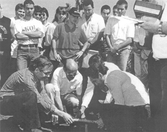 Lançamento da pedra fundamental do campus II, da Faculdade dr. Francisco Maeda, em 1988. (1) o então diretor da Fafram, Heitor Montenegro, (2) o presidente da Fundação, Roberto Mirândola, e alunos da 1ª e 2ª turmas de Agrônomos
