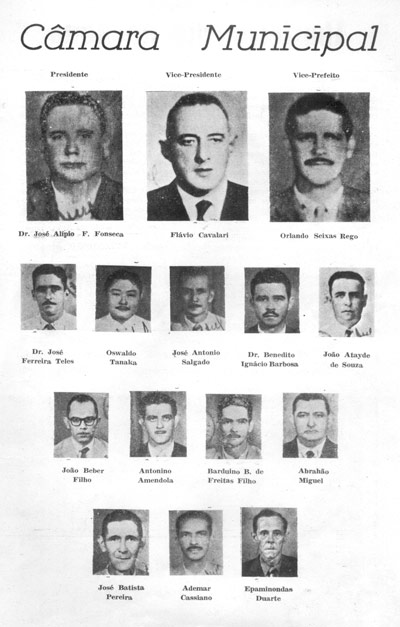 Câmara Municipal. Legislatura 1961/1964, quando o prefeito era Salvador Cordaro Cruz, e o vice-prefeito era Orlando Seixas Rego. Os vereadores: (1) Dr. José Alípio Furquim Fonseca, presidente, (2) Flávio Cavalari (vice-presidente), (3) Orlando Seixas Rego, vice-prefeito, (4) dr. José Ferreira Teles (“Dr.Juquinha”), (5) Oswaldo Tanaka, (6) José Antônio Salgado, (7) Dr. Benedito Ignácio Barbosa, (8) João Athayde de Souza, (9) João Beber Filho, (10) Antonino Amêndola, (11) Balduino Barbosa de Freitas Filho, (12) Abrahão Miguel (“Abrão Assode),(13) José Batista Pereira, (14) Adhemar Cassiano e (15) Epaminondas Duarte