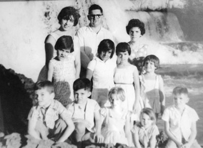 Foto de 1961, da família e amigos do dentista Evaristo José da Silveira Neto, em passeio na Cachoeira Salto Belo. (1), (2) e (3) o dr. Evaristo José da Silveira Neto e as irmãs, Leda Gervino Silveira e Santana Gervino Silveira; os filhos (4), (10) e (12) Cecília Rodrigues da Silveira Ribeiro Fonseca, Maria Ângela Silveira Cheibub (“Lela”) e Antônio Carlos Rodrigues da Silveira (“Tatai”); os amigos (5) Rosana Carvalho Rodrigues, (6) Maria Cleide de Carvalho Menezes (in memoriam) e (9) filho de um sargento que na época residia na cidade; os sobrinhos (7) Rita de