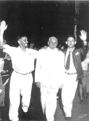 Foto dos anos 50, de uma campanha eleitoral, (1) João Antônio Macedo, que era do Partido Social Democrático (PSD), que era um dos mais influentes líderes políticos da época, (2) e (3) os vereadores Jesus Rodrigues (‘Capucha’) e Manoel Pontes Neto (‘Nelinho’)