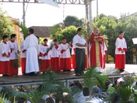 Durante a procissão, os fiéis empunharam ramos de oliveiras ou de palmeiras, cantando músicas em louvor a Jesus. Na Praça 10 de Março, o pároco da cidade, o padre Vilmar Volpato, leu trechos da Bíblia e abençoou as folhas de ramos com água benta.