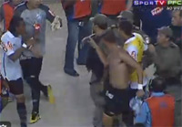Os dois começaram a discutir, com dedo no rosto e palavrões. A confusão se formou. Marquinhos e outros atletas passaram a tentar segurar o companheiro e levá-lo para o vestiário. Em dado momento, um policial apareceu ao lado de Marquinhos e, aparentemente, o atingiu ou o empurrou pelas costas. Neymar, então, saiu correndo novamente e voltou a tentar ir para cima de João Marcos. As imagens das câmeras seguiram o atacante. E, neste momento, Marquinhos apareceu caído no chão com as mãos nas costas. Os jogadores santistas, então, partiram para cima de um polícial, que passou a ser acusado de ter agredido o atleta.