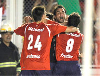 Galeano e Fredes, que fez o segundo, abraçam Parra, autor do primeiro gol do Independiente (Foto: Reuters)