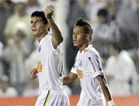 Acompanhado por Neymar, Ganso comemora o gol único do Santos na partida (Foto: AFP)