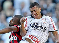 O uruguaio Morro Garcia (na bola com o corintiano Ralf) perdeu um gol feito no 1º tempo (Foto: Ag. Estado)