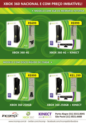 O e-mail enviado para lojistas pela Incomp aponta que o Xbox 360 com 4 GB de espaço de armazenamento será vendido por R$ 700. A versão com disco rígido de 250 GB custará R$ 1 mil. Antes, os consoles eram vendidos a R$ 1,3 mil e R$ 1,6 mil, respectivamente. Há ainda pacotes do console com o acessório Kinect que serão vendidos por R$ 1 mil (4 GB) e R$ 1,3 mil (250 GB).