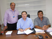 O gerente da Caixa, Valcis Faria Félix; prefeito Matsubara e vereador Celim assinam o convênio no Gabinete
