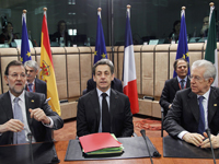 Premiê espanhol Mariano Rajoy Brey (esquerda), presidente da França Nicolas Sarkozy (centro) e premiê italiano Mario Monti (direita) participam de reunião da União Euorpeia em Bruxelas