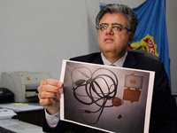 O delegado da Polícia Federal, Nelson Edilberto Cerqueira exibe foto do “ponto eletrônico”, que era usado pelo grupo para fraudar vestibulares de Medicina