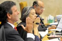 Os ministros Luiz Fux, Cármen Lúcia e Gilmar Mendes durante continuação do julgamento do Supremo Tribunal Federal sobre a constitucionalidade da reserva de vagas em universidades públicas, com base no sistema de cotas raciais da Universidade de BrasíliaMinistros da Casa de Leis entenderam que cotas são necessárias para reduzir desigualdade
