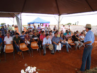 O diretor da Fafram, Márcio Pereira, fala na abertura do evento (primeiro plano), e o presidente da APPA, Ronaldo Spirlandelli de Oliveira, sentado com o chapéu na mão