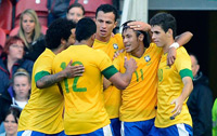 O sorriso verde e amarelo, provocado pelo protetor dentário de Sandro, era igual à felicidade de Mano Menezes com o sucesso de uma jogada ensaiada. Após o gol, o Brasil viveu momento de instabilidade na partida. Neymar parecia irritado com a dificuldade nas jogadas. E ficou ainda mais com as vaias da torcida britânica.