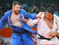 Após duas vitórias por ippon, o gigante brasileiro caiu. Em decisão nas bandeiras, Rafael Silva, de 2,03m, perdeu para o tricampeão mundial Alexander Mikhaylin. Contra o russo, "Baby", como é conhecido o sul-matogrossense, foi derrotado nas quartas de final e deu adeus ao sonho do ouro nos pesos-pesados (acima de 100kg). Ele, todavia, segue em busca de uma medalha de bronze, e encara o húngaro Barna Bor na repescagem a partir de de 10h (horário de Brasília) Toda a seleção brasileira se desesperava na arquibancada. "Mete a mão nele, amassa", gritava o pequenino Felipe Kitadai, bronze na categoria mais leve do judô, a ligeiro (até 60kg). "Raça, garoto!", pedia Luciano Corrêa, da meio-pesado (até 100kg).O russo de 1,95m tentou as primeiras entradas, mas Baby mostrava boa base e se recusava a cair. O brasileiro não se intimidou e também foi para cima, mas o europeu defendia bem sua mão esquerda. Com mais de metade da luta, nenhum dos dois judocas havia pontuado ou sido punido. Rafael seguiu insistindo no ochi-gari e Mikhaylin, preocupado na defesa, sofreu um shido (advertência) com 1m19s para o fim. O russo passou a ser mais ativo, mas ninguém conseguiu pontuar no tempo regulamentar.