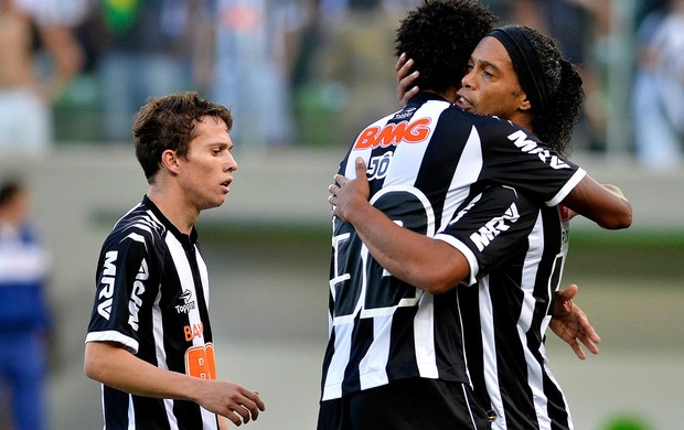Ronaldinho abraça Jô (Bernard atrás), após o segundo gol do Atlético-MG (Foto: Pedro Vilela / Ag. Estado