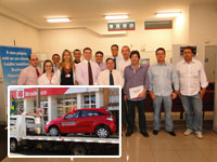 Equipe e clientes do Bradesco: o contemplado Ronaldo Spirlandeli de Oliveira exibe o certificado que recebeu por ter sido sorteado; no destaque, O automóvel Agile Chevrolet em frente à agência do Bradesco em Ituverava