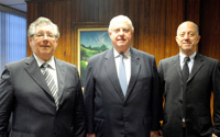O presidente da Assembléia Legislativa, deputado Barros Munhoz, ladeado pelo atual prefeito de Guará, Marco Aurélio Migliori, e pelo prefeito eleito, “Zé Abboud”
