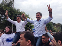 Senador Aécio Neves (MG) é carregado por assessores e seguranças ao lado de Beto Richa, governador do Paraná, em Curitiba