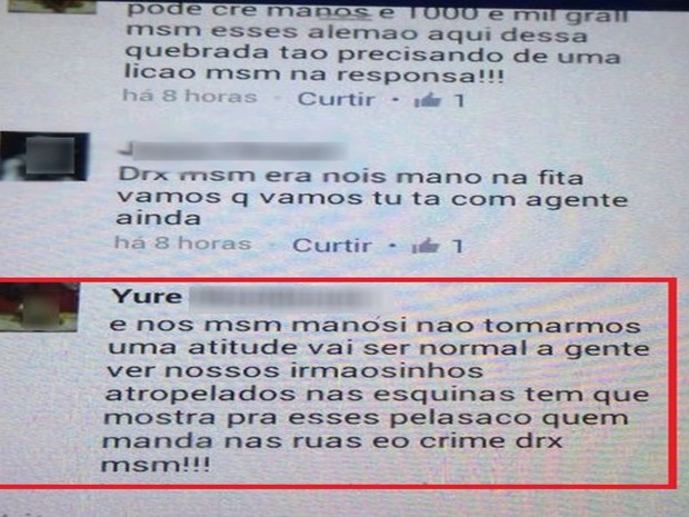 Um dos envolvidos no crime chegou a trocar tiros com o sargento e foi morto no local da tentativa de assalto. No Facebook, um comentário na foto do suspeito morto sugere que os criminosos da cidade deveriam tomar uma atitude para combater a segurança pública. “E nós mesmos mano, se não tomarmos uma atitude vai ser normal a gente ver nossos irmãozinhos atropelados nas esquinas, tem que mostrar para esse ‘pelasacos’ que quem manda nas ruas é o crime mesmo”, comenta um homem conhecido como “Yure”.