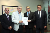 O assessor parlamentar de Barros Munhoz, Paulo Roberto de Freitas; o secretário estadual da Habitação, Sílvio Torres, o prefeito Walter Gama Terra Júnior e o assessor especial do prefeito, Ricardo José Sandoval Garcia. Foto de Márcio/CDHUPrefeito se reuniu com secretário da Habitação, por intermédio do deputado Barros Munhoz