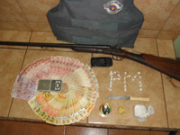 Objetos apreendidos no localEle portava 72 gramas de cocaína e uma espingarda calibre 28