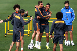 Mas o Real tem alguns problemas para o jogo. Apesar de ter treinado na véspera da partida depois de ficar fora da atividade de segunda-feira por causa de uma gripe, Bale não se integrou ao time na concentração à noite e virou dúvida. Pode ser poupado e começar no banco de reservas, assim como o lateral-esquerdo Marcelo, que ainda não está 100%, e, pelo discurso de Ancelotti, deve ser reserva de Fabio Coentrão. Formam a defesa ao lado do português Casillas, Carvajal, Sergio Ramos e Pepe. No meio, Xabi Alonso, Modric e Di María estão confirmados, assim como Benzema na frente com CR7. Se o galês não entrar em campo no início, o substituto mais provável é Isco.