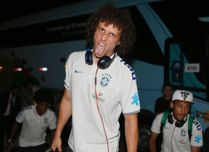Ao lado de Willian e Neymar, David Luiz faz sua famosa careta na chegada (Foto: Rafael Ribeiro / CBF)