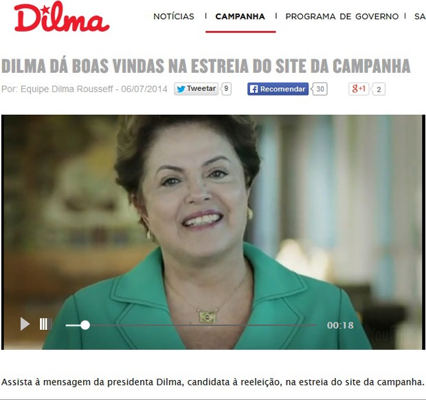 A presidente Dilma Rousseff (PT) afirmou em vídeo publicado neste domingo, na estreia do site oficial da campanha à reeleição, que a disputa eleitoral deste ano será uma das mais "politizadas" da história do Brasil e defendeu que a campanha seja de "alto nível".